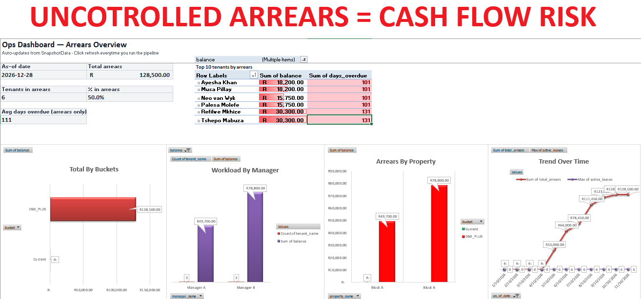 Excel Ledger ↓ Python Arrears Engine ↓ FIFO Allocation Logic ↓ Arrears Snapshot + Reminders ↓ Operational Dashboard